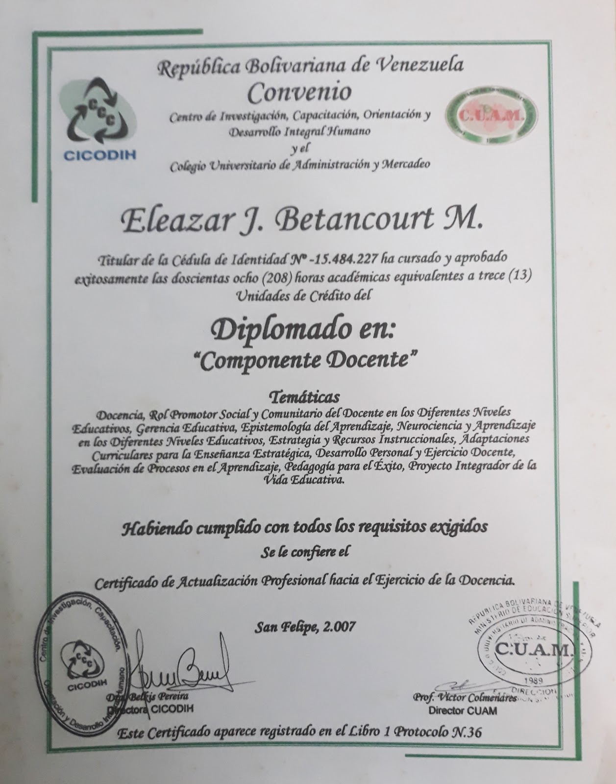El Colegio Universitario de Administración y Mercadeo (CUAM), en alianza con el Centro de Investigación, Capacitación, Orientación y Desarrollo Integral Humano (CICODIH), ofrece el Componente Docente. Este programa está diseñado para profesionales de diversas áreas que desean obtener formación pedagógica formal, cumpliendo los requisitos legales y académicos para ejercer la docencia en instituciones educativas en Venezuela y en contextos internacionales.