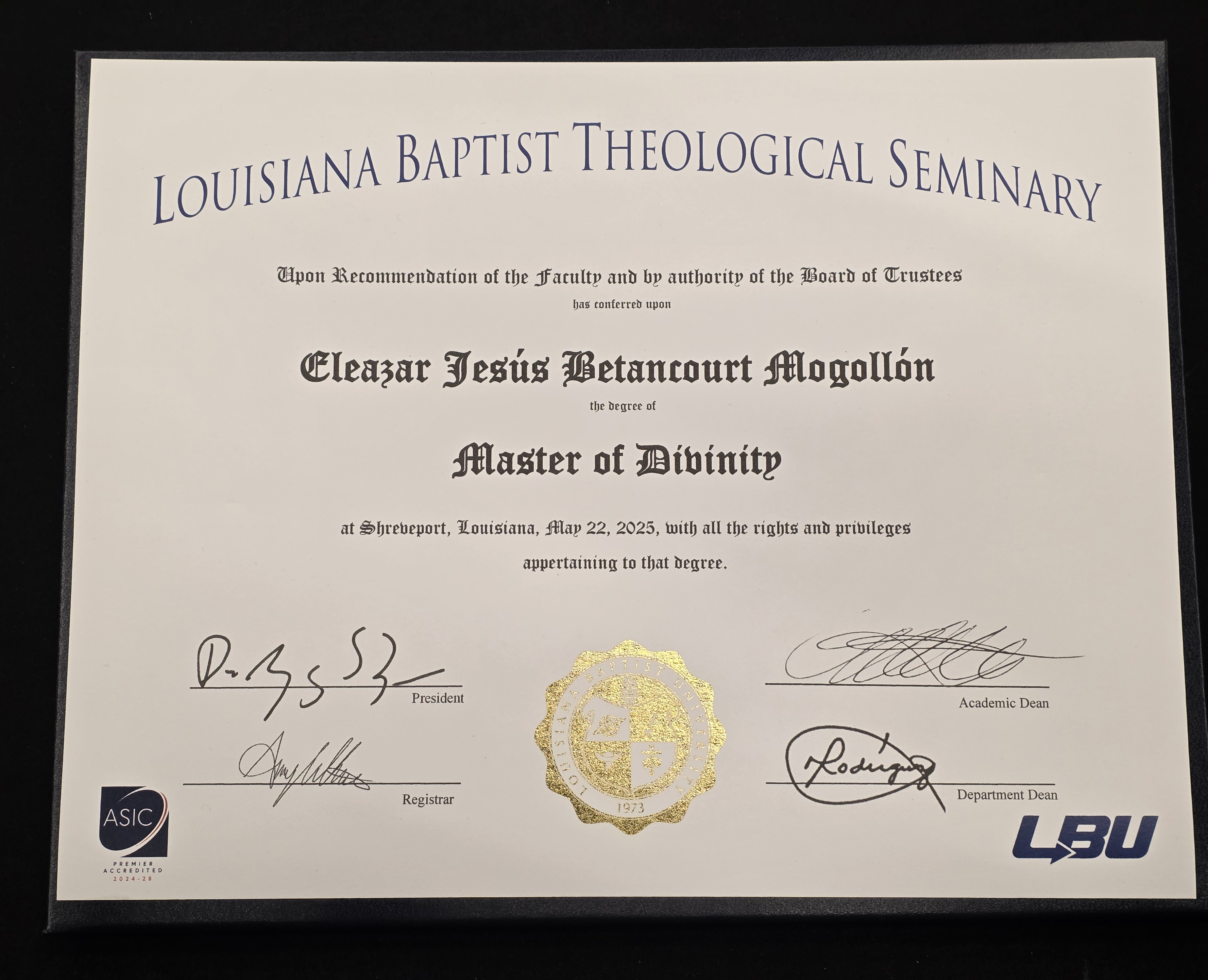 “El egresado de la Maestría en Divinidad de Louisiana Baptist University es un ministro y teólogo preparado para predicar, enseñar y liderar con fidelidad bíblica y enfoque misional. Su formación avanzada en Escrituras, teología y cuidado pastoral le capacita para servir en iglesias locales, misiones y ministerios educativos, comprometido con la verdad del Evangelio y el servicio a la iglesia global.”